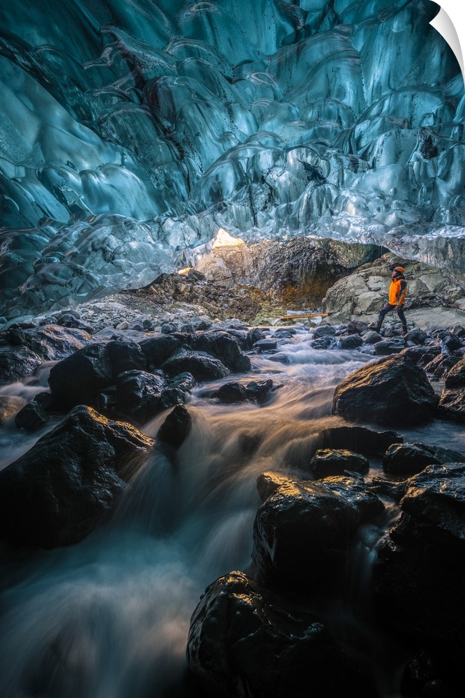 <p>Vatnajokull glacier, Eastern Iceland, Iceland, Northern Europe. Man standing still at the entrance of a crystal ice cave in winter.</p>