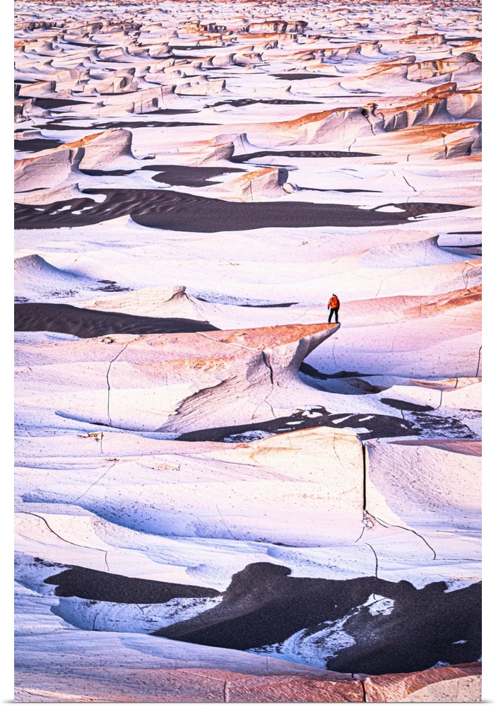 <p>Man standing on colorful volcanic rocks at sunrise, Campo de Piedra Pomez, El Penon, Catamarca, Argentina.</p>