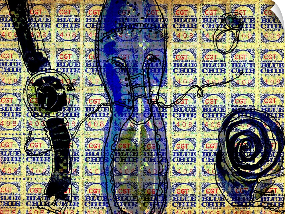 <p>A wristwatch, ring, belt and dress shoe with a blue chip stamp background.</p>