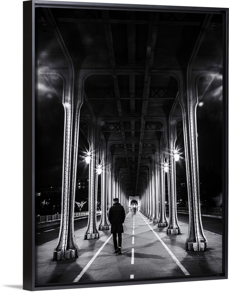 <p>Black and white photograph of a man walking under an overpass in Paris.</p>