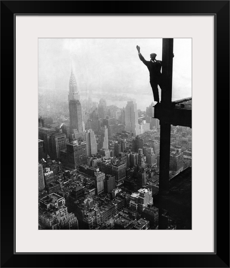 <p>Far above downtown Manhattan, a man holds onto a girder and waves from the construction site of the Empire State Building. June 10, 1930.</p>