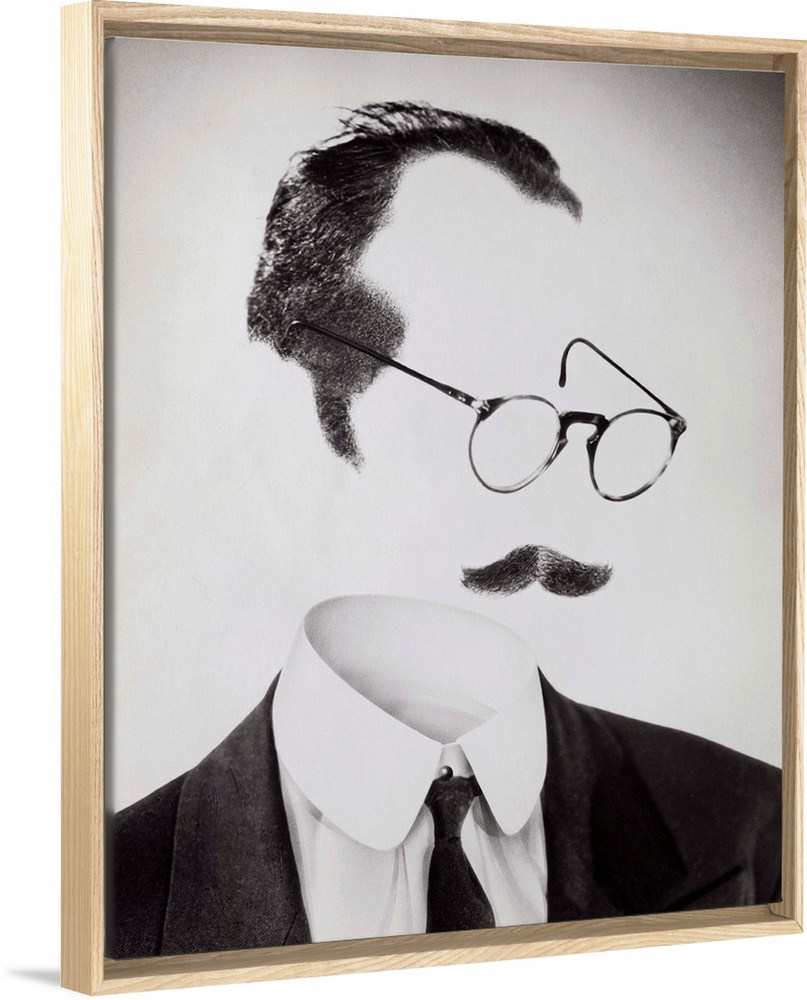 <p>Portrait of a man with an invisible face. The only visible elements are his hair, his mustache and a pair of eyeglasses.</p>