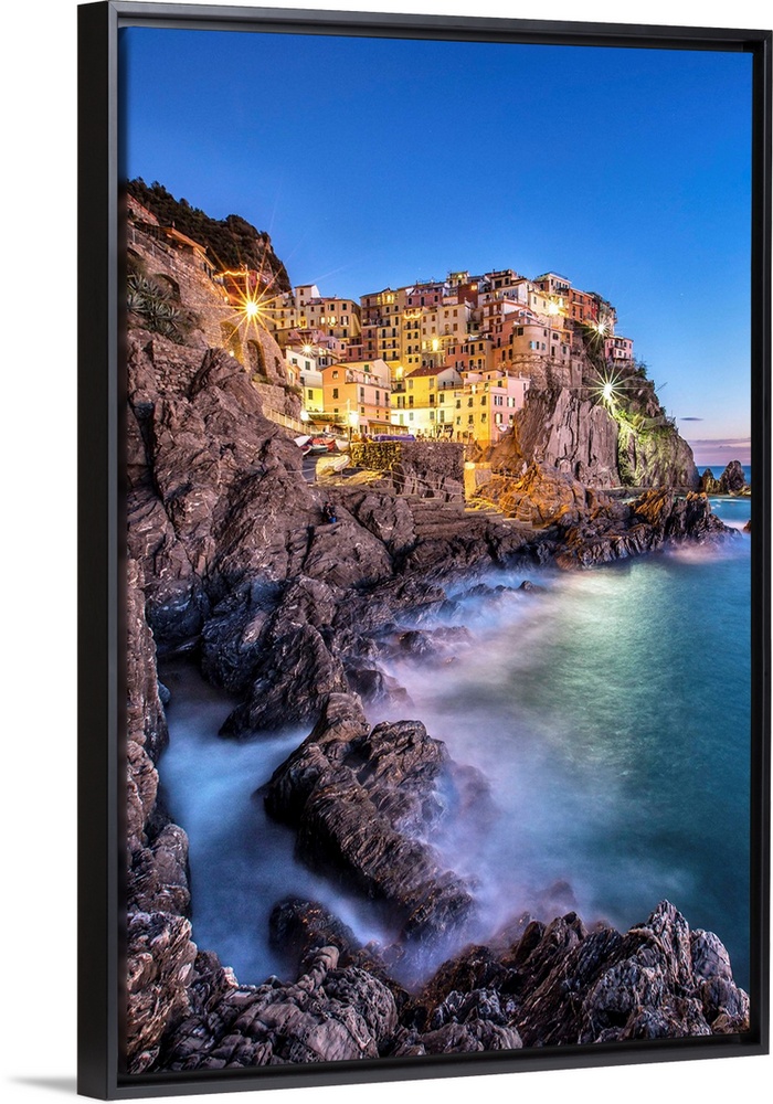 <p>Manarola village illuminated by the blue light of dusk with its typical pastel colored houses. Cinque Terre National Park. La Spezia. Liguria. Italy. Europe.</p>