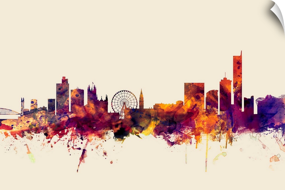 <p>Contemporary artwork of the Manchester city skyline in watercolor paint splashes.</p>