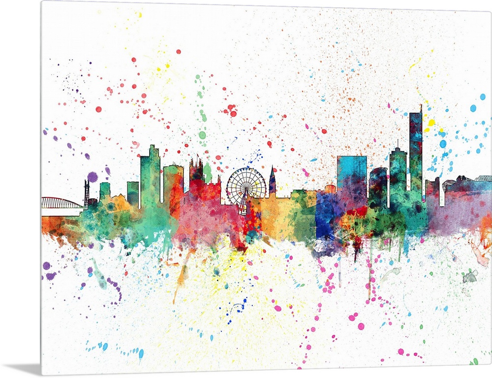 <p>Watercolor art print of the skyline of Manchester, England, United Kingdom</p>