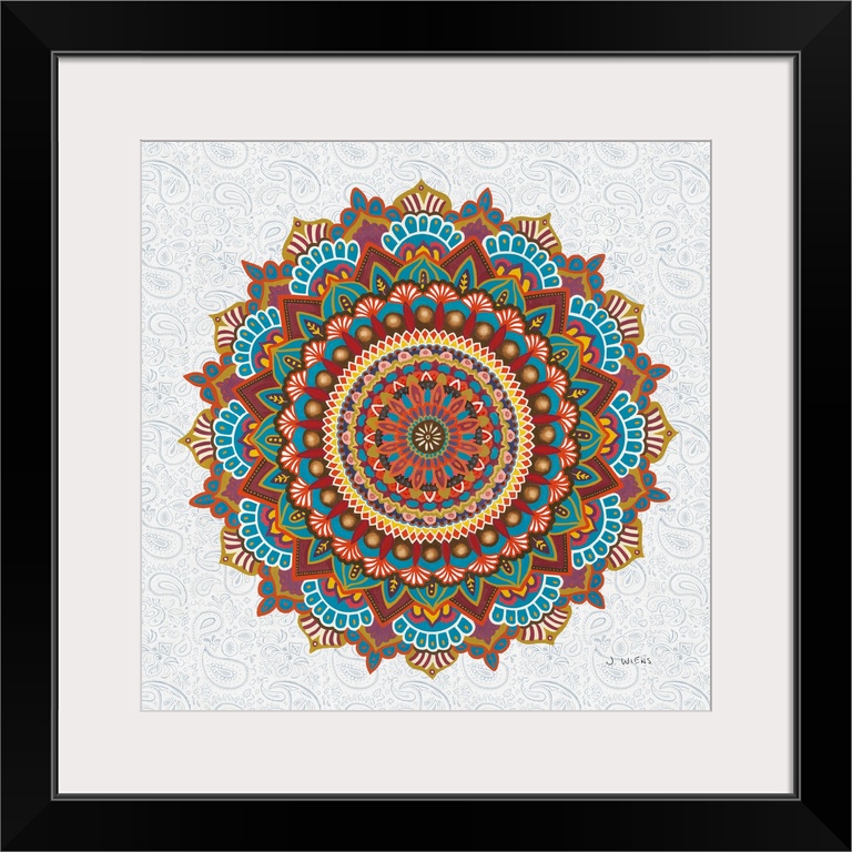 <p>A beautifully colored mandala design in warm tones on a paisley patterned background.</p>