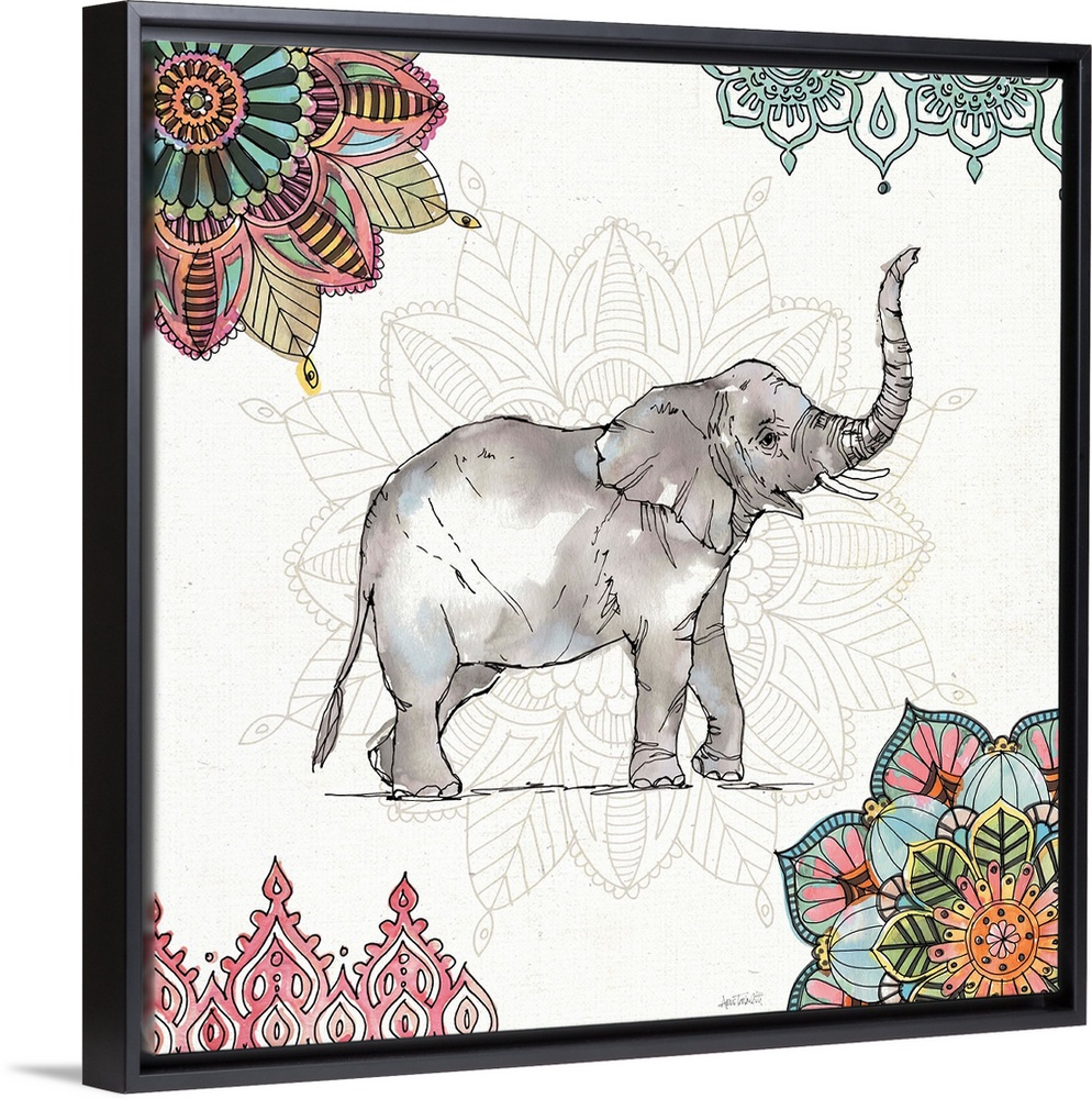 <p>Bohemian style decor with an illustration of an elephant with colorful mandalas all around.</p>
