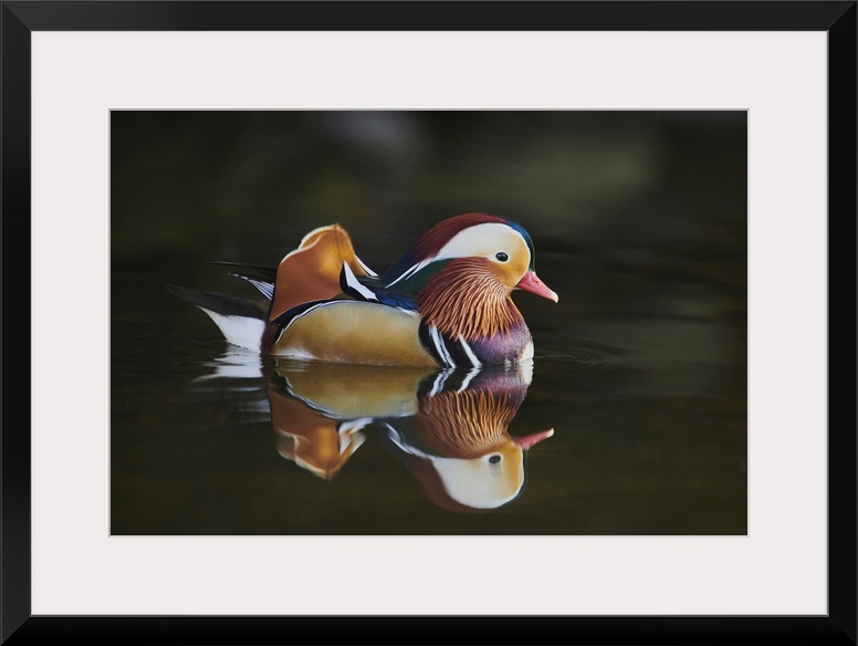 <p>Mandarin duck (Aix galericulata) male swimming on a lake, Bavaria, Germany</p>