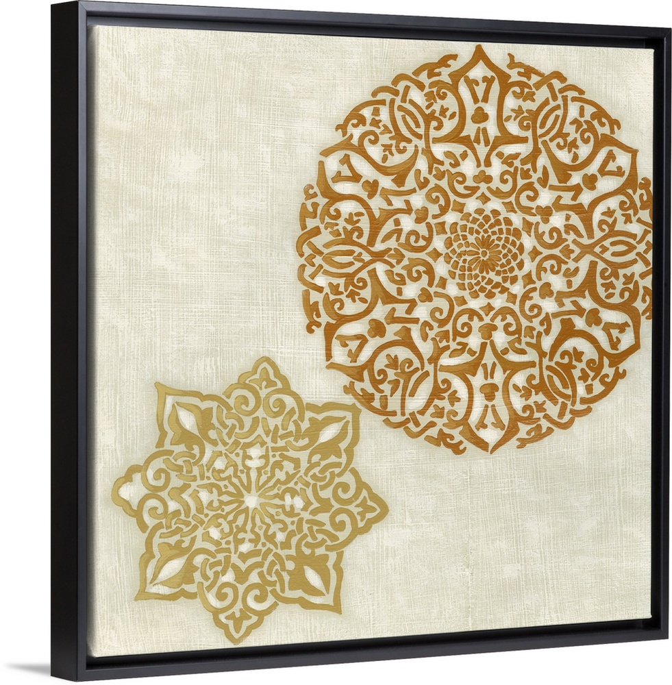 <p>Contemporary decor artwork of detailed ornate gilded designs against a rustic background.</p>