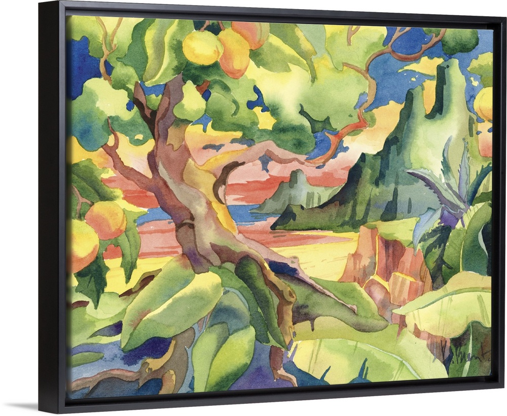 <p>Tropical painting of a large mango tree near a rocky mountain.</p>