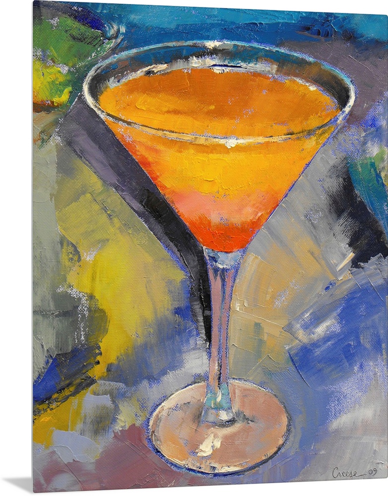 <p>Vertical, large contemporary painting of a vibrant mango martini in a glass, on a multicolored background of thick, short brushstrokes.</p>