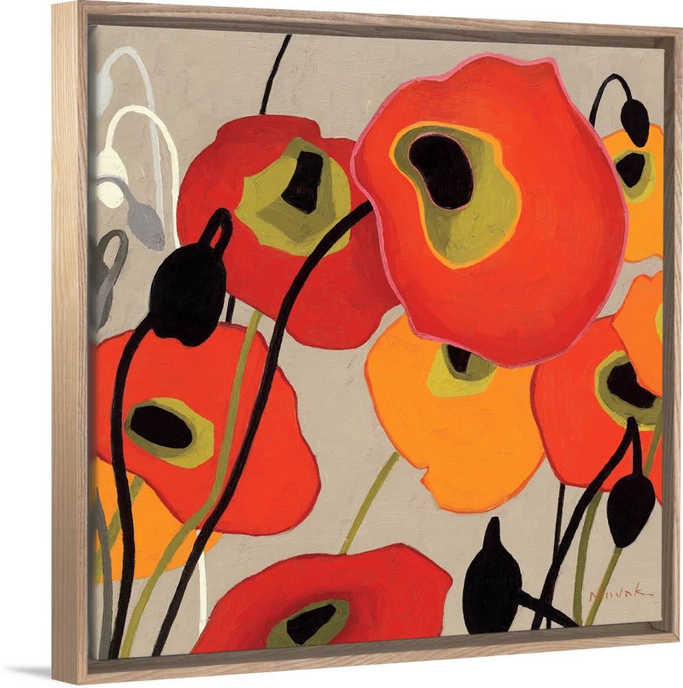 <p>This contemporary abstract painting showcases simplified poppies painted with flat colors over a neutral background.</p>