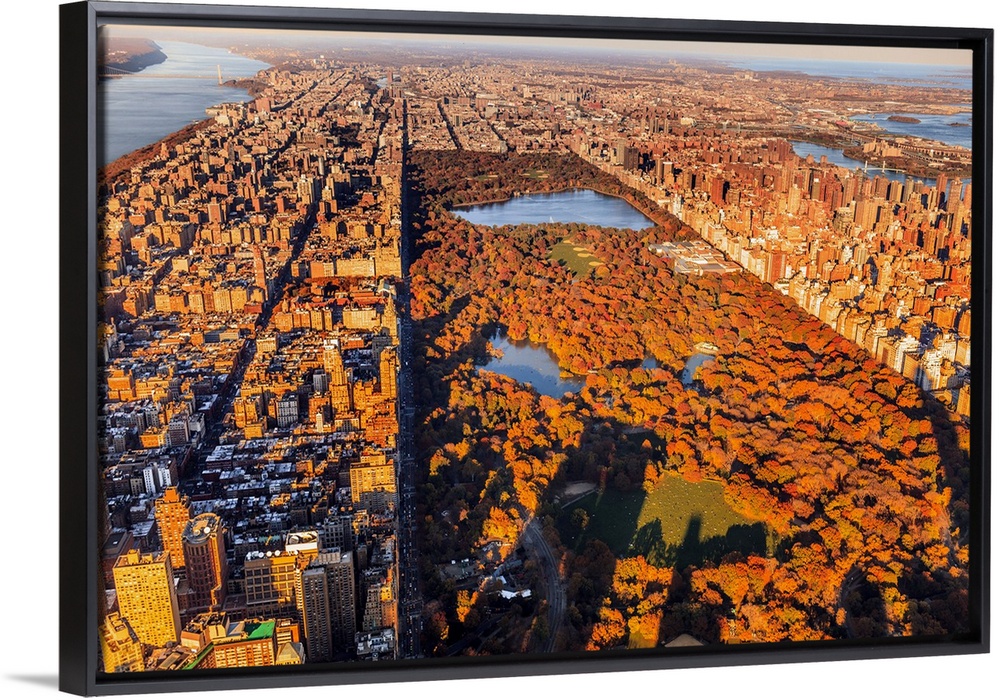 <p>USA, New York City, Manhattan, Aerial view towards Central Park with foliage at sunset</p>