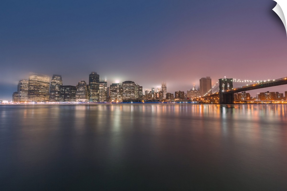 <p>Long exposure of New York City's lower Manhattan and Brooklyn Bridge, with traces of ship lights crossing East River.</p>