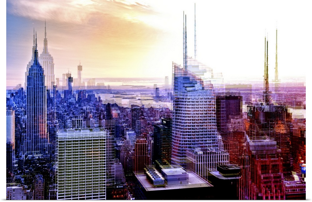 <p>Photo of the Manhattan skyline at sunset in the evening with a layered effect creating a feeling of movement.</p>