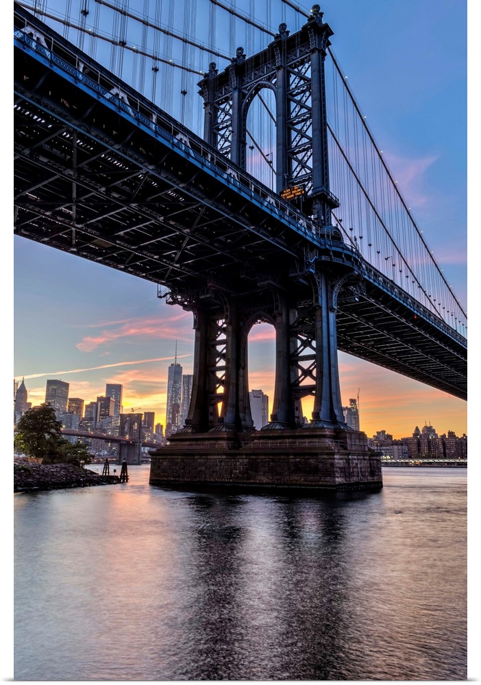 <p>Manhattan Bridge and NYC skyline at sunset, Brooklyn Bridge Park; Brooklyn, New York, United States of America</p>