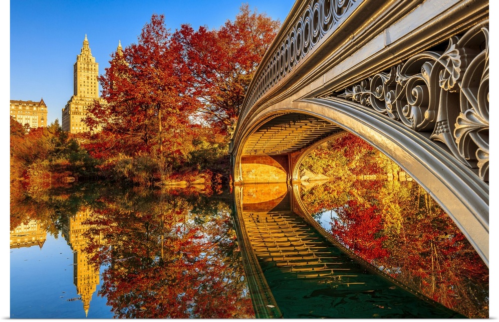 <p>USA, New York City, Manhattan, Central Park, Bow Bridge and San Remo apartment building in the foliage</p>