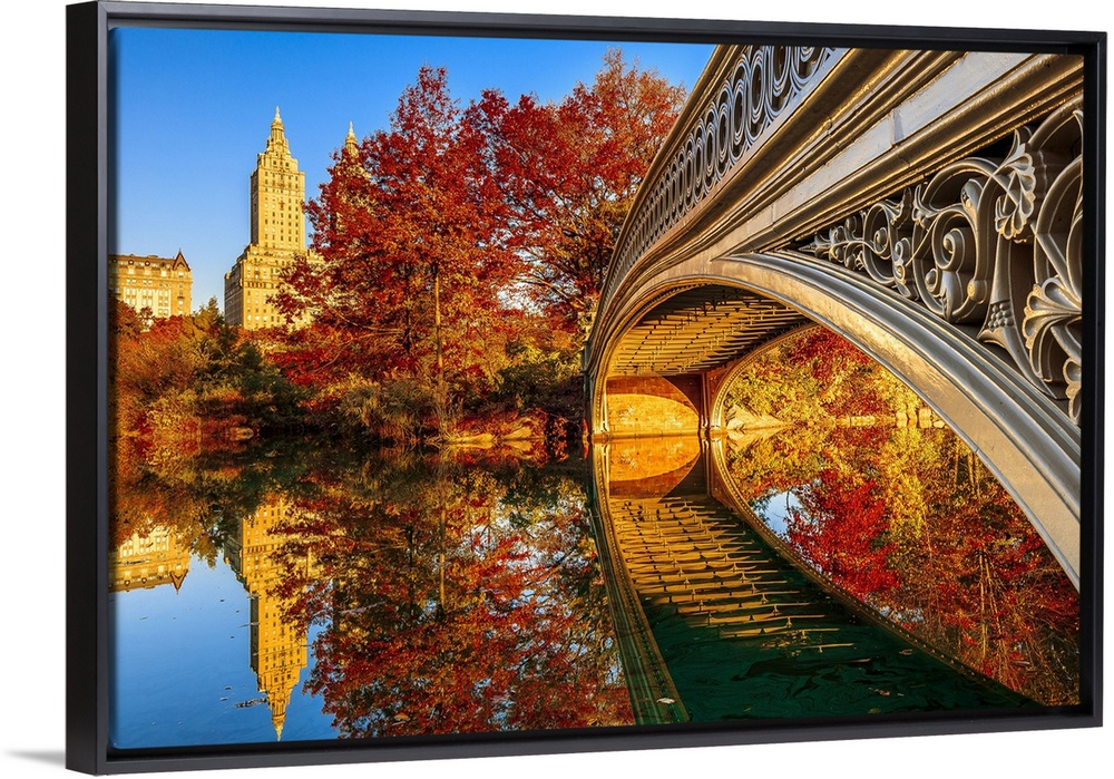 <p>USA, New York City, Manhattan, Central Park, Bow Bridge and San Remo apartment building in the foliage</p>