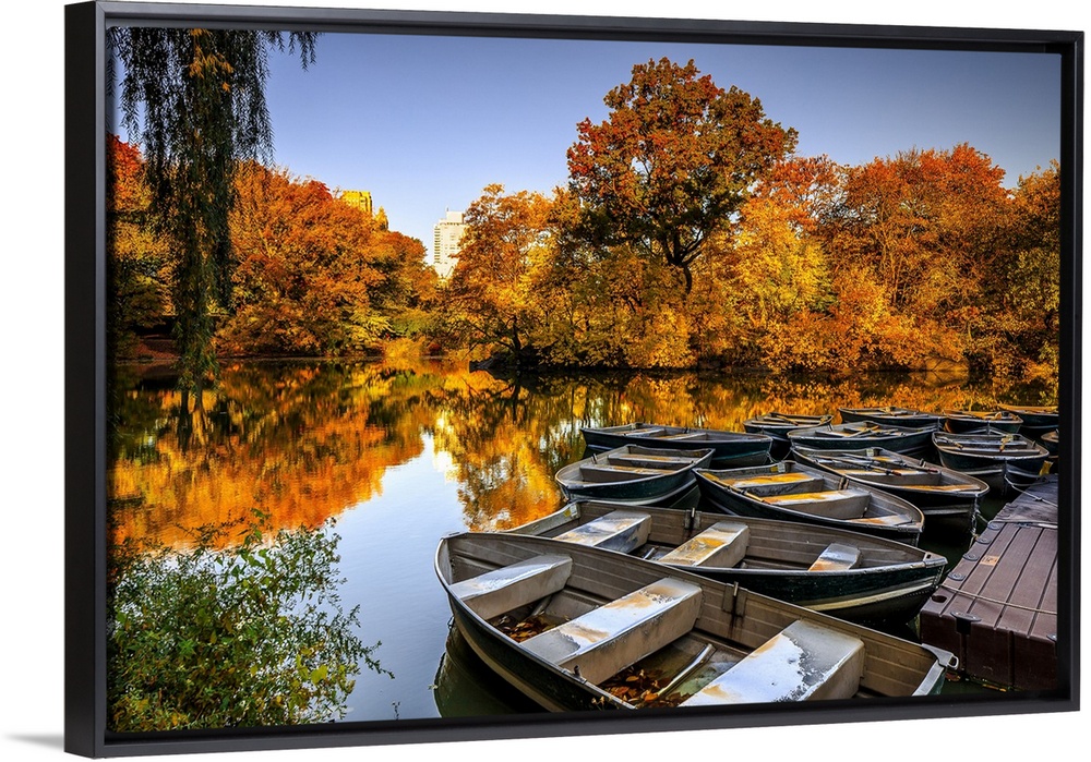 <p>USA, New York City, Manhattan, Central Park, Lake with boats and foliage</p>