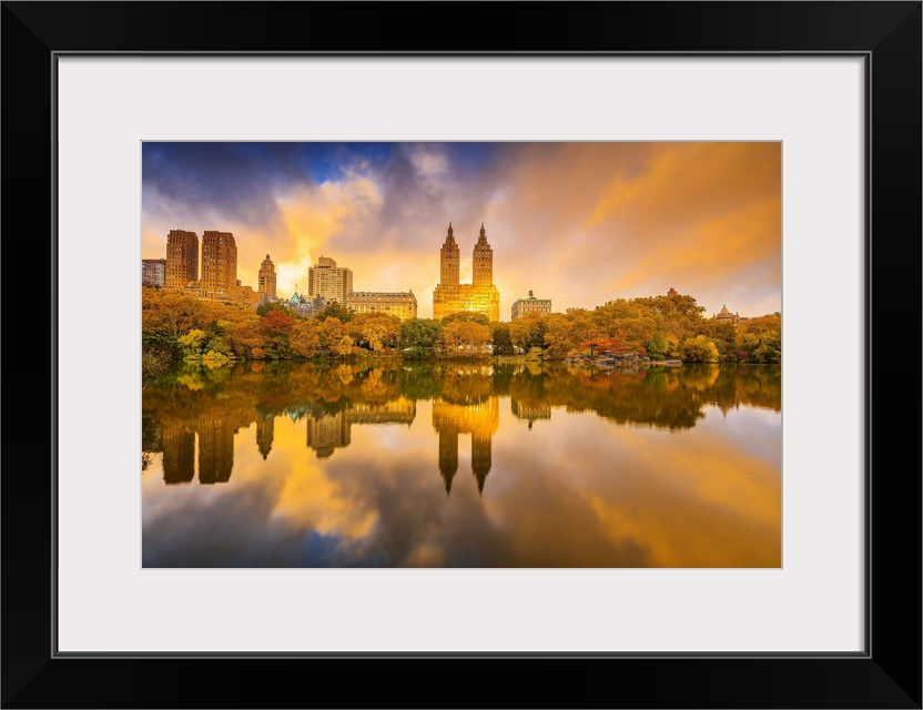 <p>USA, New York City, Manhattan, Central Park, The lake and San Remo apartment building, foliage</p>