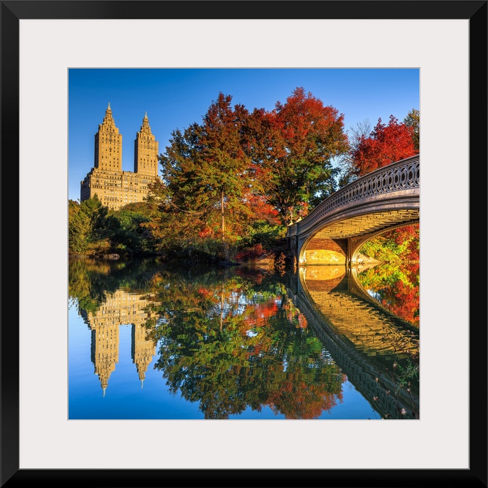 <p>USA, New York City, Manhattan, Central Park, The lake, Bow Bridge and San Remo Apartment building</p>