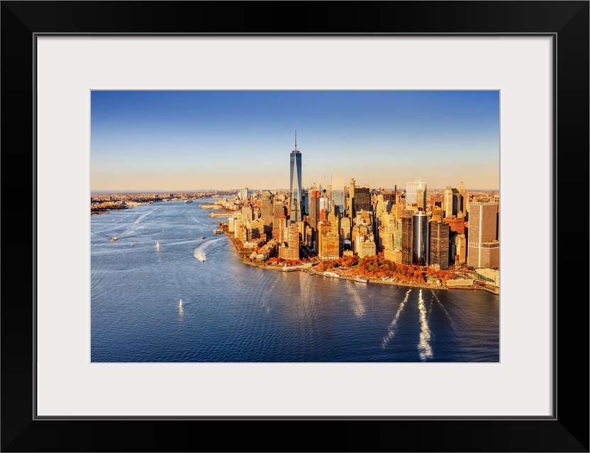 <p>USA, New York City, Manhattan, Lower Manhattan, Freedom Tower, Aerial view towards One World Trade Center at sunset</p>