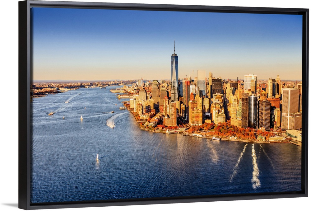<p>USA, New York City, Manhattan, Lower Manhattan, Freedom Tower, Aerial view towards One World Trade Center at sunset</p>
