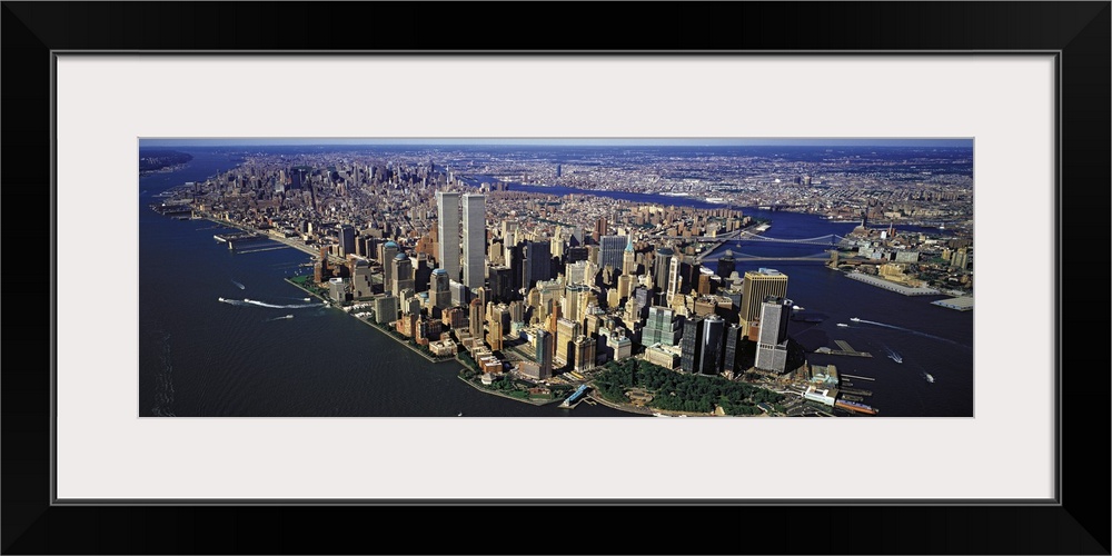 <p>Panoramic, aerial photograph of New York City, including the World Trade Center.</p>