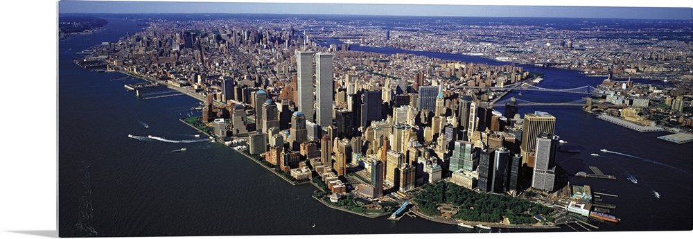 <p>Panoramic, aerial photograph of New York City, including the World Trade Center.</p>