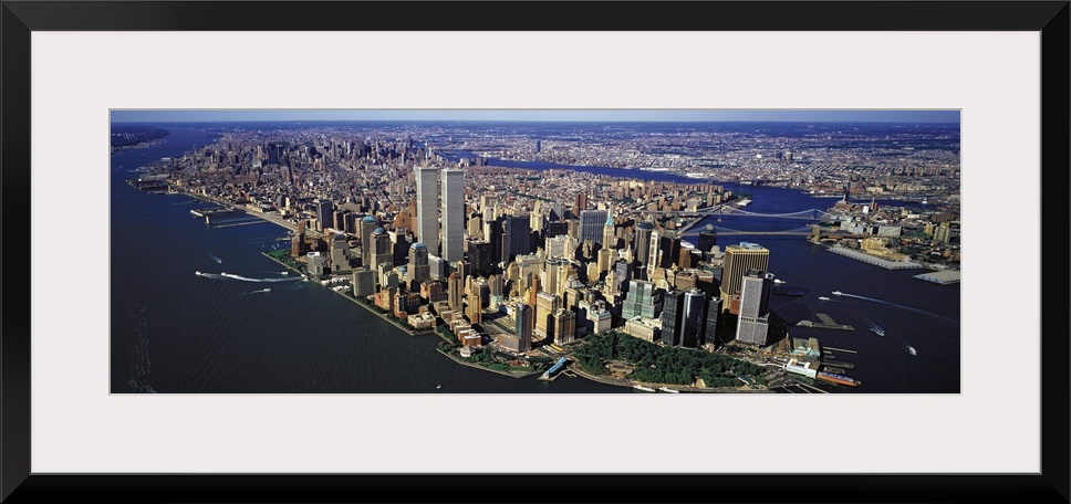 <p>Panoramic, aerial photograph of New York City, including the World Trade Center.</p>