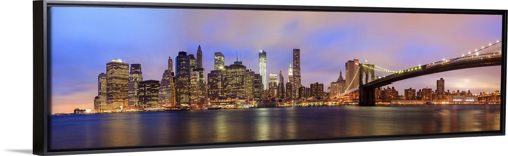 <p>View of Manhattan skyline and Brooklyn Bridge at dusk.</p>