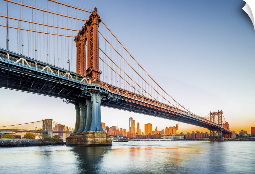 <p>USA, New York City, East River, Manhattan, Lower Manhattan, Manhattan Bridge, Brooklyn Bridge and Freedom Tower in background at sunrise</p>