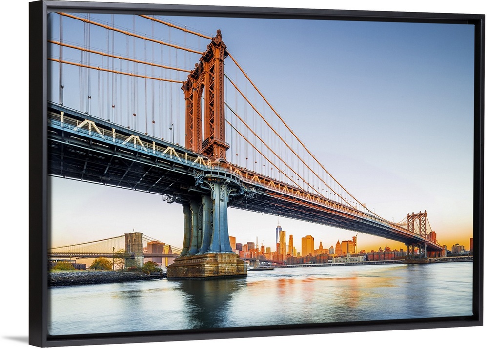 <p>USA, New York City, East River, Manhattan, Lower Manhattan, Manhattan Bridge, Brooklyn Bridge and Freedom Tower in background at sunrise</p>