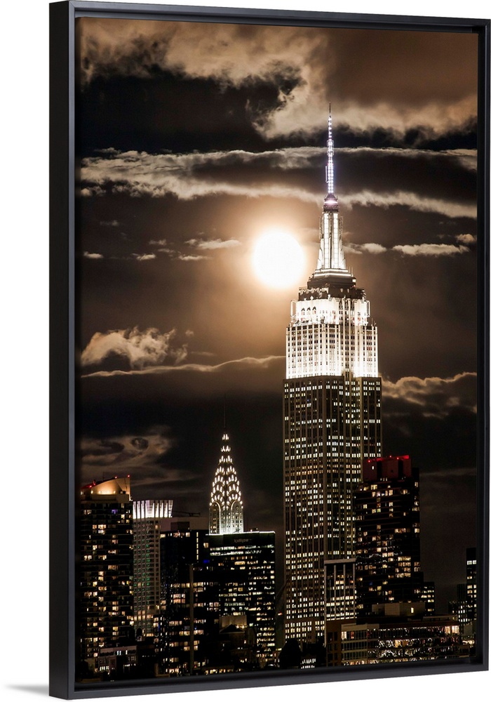 <p>Manhattan, Moonrise over the Empire State Building and Midtown Manhattan looking across the Hudson River, New York, United States of America.</p>
