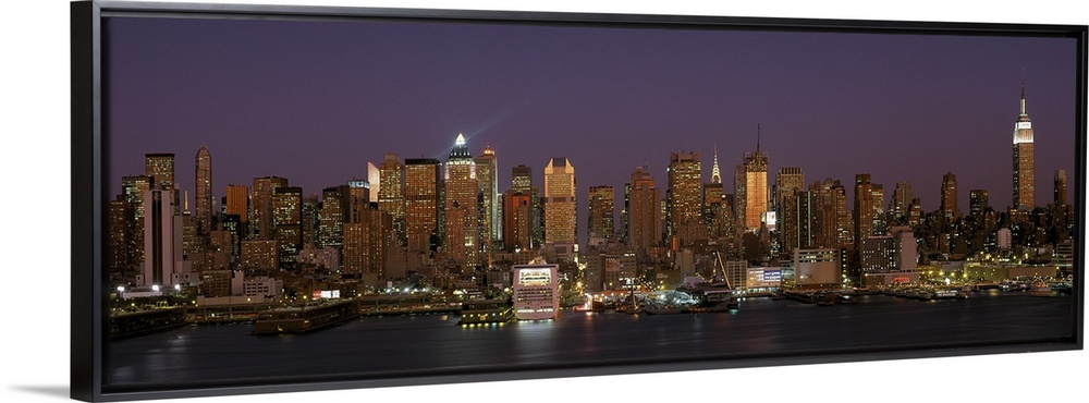 <p>Wide angel, distant photograph of the Manhattan skyline, lit at night, beneath a deep purple sky in New York.</p>