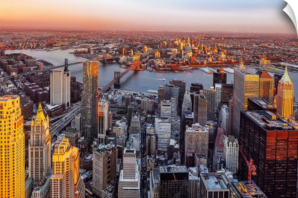 <p>USA, New York City, East River, Manhattan, Lower Manhattan, One World Observatory at One World Trade Center, view from the Freedom Tower observatory deck towards Beekman Tower, Chase Manhattan, Trump Building, Brooklyn bridge and Manhattan bridge</p>