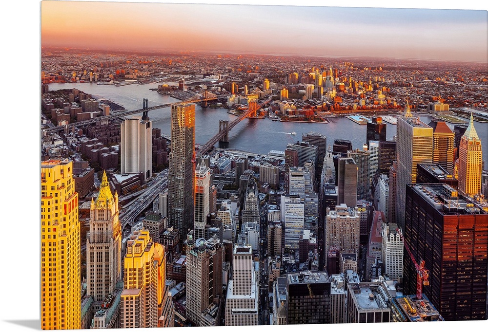 <p>USA, New York City, East River, Manhattan, Lower Manhattan, One World Observatory at One World Trade Center, view from the Freedom Tower observatory deck towards Beekman Tower, Chase Manhattan, Trump Building, Brooklyn bridge and Manhattan bridge</p>