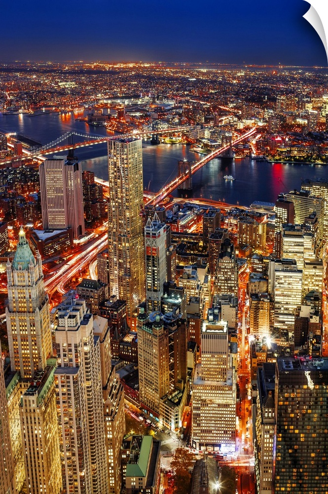 <p>USA, New York City, East River, Manhattan, Lower Manhattan, One World Observatory at One World Trade Center, view from the Freedom Tower observatory deck towards Beekman Tower, Chase Manhattan, Trump Building, Brooklyn bridge and Manhattan bridge</p>