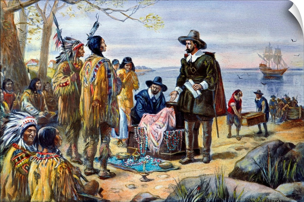 <p>Peter Minuit (1580-1638) Dutch colonial official in America. Peter Minuit's purchase of Manhattan Island, 1626, after the paintingby Alfred Fredericks.</p>