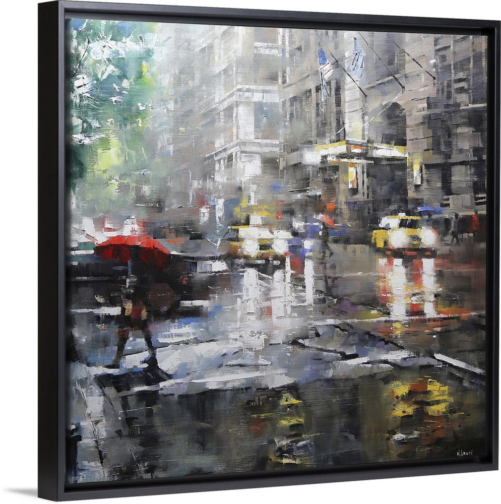 <p>Contemporary painting of a pedestrian with a red umbrella crossing the street near taxis in New York City.</p>