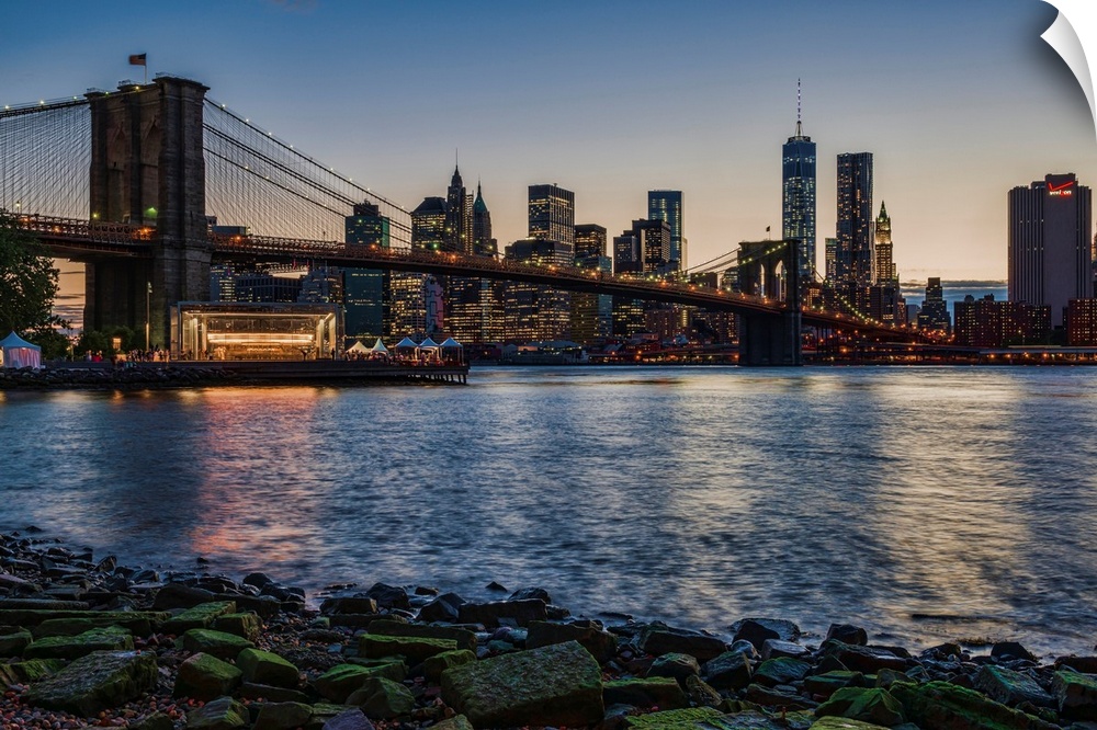 <p>Manhattan skyline at twilight with Brooklyn Bridge, Brooklyn Bridge Park, Brooklyn, New York City, New York.</p>