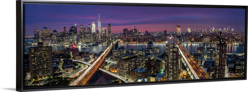 <p>View over Manhattan and Brooklyn skyline during sunset.</p>