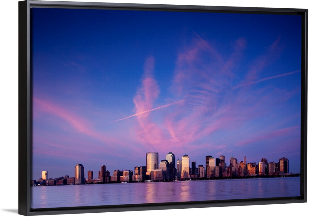 <p>USA, New York, New York City, Setting sun lights clouds above Manhattan skyline, viewed from New Jersey waterfront</p>