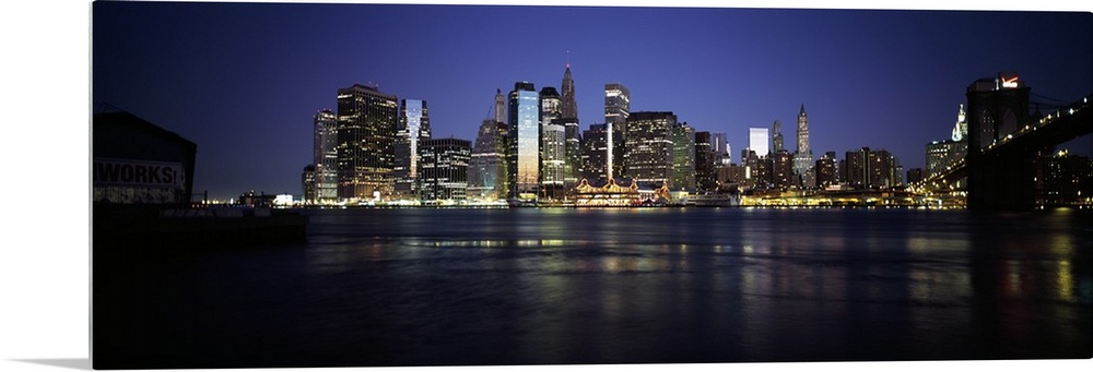<p>Panoramic photo of the NYC cityscape lit up at night seen from the water.</p>