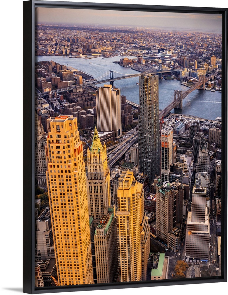 <p>USA, New York City, East River, Manhattan, Lower Manhattan, the Freedom Tower observatory deck, one world observatory, Beekman Tower, Chase Manhattan, Trump Building, Brooklyn bridge and Manhattan bridge</p>