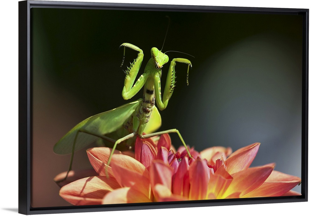 <p>Praying mantis stance on dahlia flower with both forelimbs raising up.</p>
