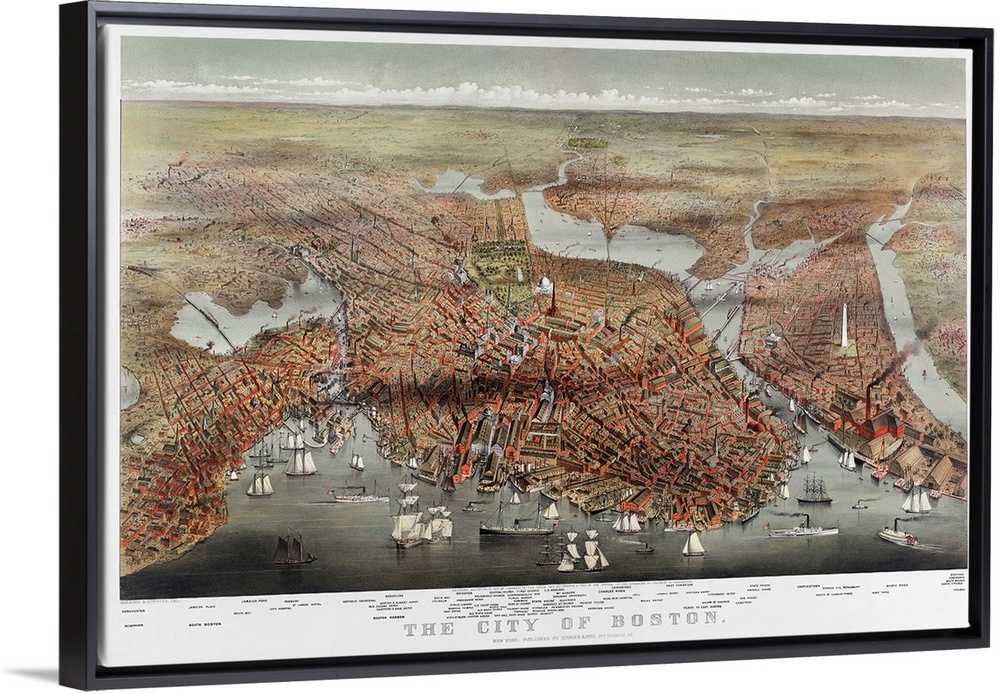 <p>Map, Boston, C1873. 'The City Of Boston.' Bird's-Eye View Of Boston, Massachusetts. Chromolithograph, c1873.</p>