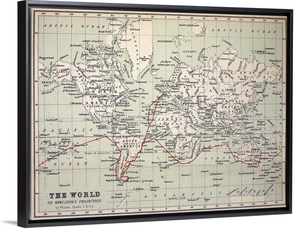 <p>Map of the World with Voyage of the Beagle coloured in red. Appendix from \The Voyage of HMS Beagle\ by Charles Darwin (Cover Title) New Edition 1890 John Murray Publishers. Coloured print, retaining gentle age-toning of the original.</p>