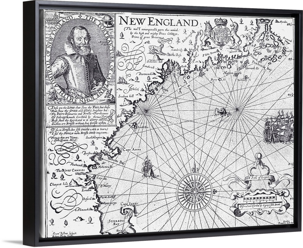 <p>Smith's Map of New England. Inset, a portrait of Captain John Smith, admiral of New England.</p>