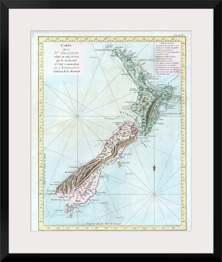<p>French copy of Cook's first map of New Zealand, showing the route of the Endeavour around the islands from October 6, 1769, to April 1, 1770. ?Carte de la Nle. Zelande visite e en 1769 et 1770 par le Lieutenant J. Cook Commandant de l?Endeavour, vaisseau de sa Majeste.? Copperplate map, with added color, 46 x 36 cm. From John Hawkesworth?s Relation des voyages entrepris par ordre de Sa Majeste Britannique...(Paris, 1774).</p>